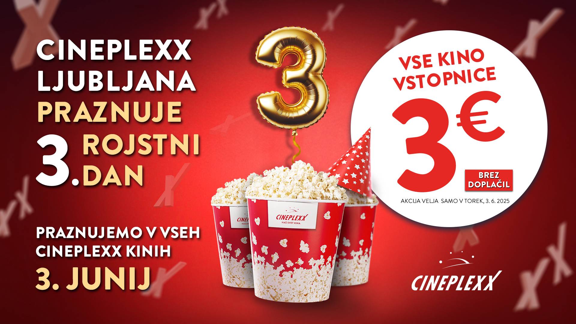 Cineplexx Ljubljana RudnikCineplexx Ljubljana praznuje 3. rojstni dan. V torek, 3. junija bo praznovanje potekalo v vseh Cineplexx kinih. Vse kino vstopnice po NORO UGODNI CENI 3 evre.