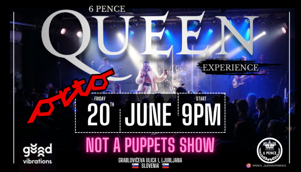 Orto BarPredstavil se bo izvrstni italijanski Queen tribute band iz Trsta, 6 PENCE-Queen Tribute. Band vas bo popeljal na potovanje od začetkov skupine Queen pa do zadnjega koncerta…live at Wembley 86.