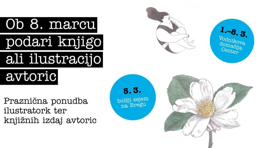 Pisarna Ljubljane, Unescovega mesta literature v sodelovanju s slovenskimi založniki in Centrom ilustracije ob 8. marcu z ① začasno mini knjigarno, ② prodajno razstavo in ⓷ sprehodom po ženski literarni Ljubljani spodbujata k nakupu knjig in ilustracij avtoric.