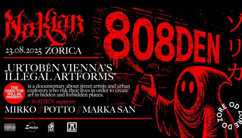 ZoricaNa avgustovskem 808DEN sešenu si boste lahko premierno v Sloveniji ogledali dokumentarni film Urtobēn Vienna’s Illegal Artforms. Gre za dokumentarec o uličnih artistih in urbanih raziskovalcih, ki tvegajo svoja življenja za to, da ustvarjajo na skritih in prepovedanih mestih. Za vse, ki vas bo o dunajski sceni zanimalo več, bo na dogodku prisoten tudi režiser filma.