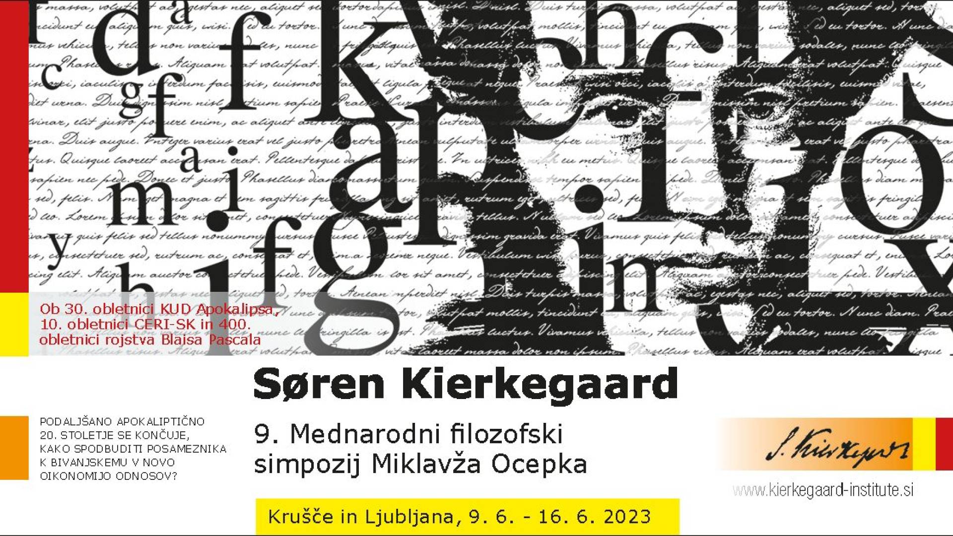 Simpozij je posvečen 30. obletnici KUD Apokalipsa, 10. obletnici Srednjeevropskega raziskovalnega inštituta Soeren Kierkegaard in 400. obletnici rojstva Blaisa Pascala.