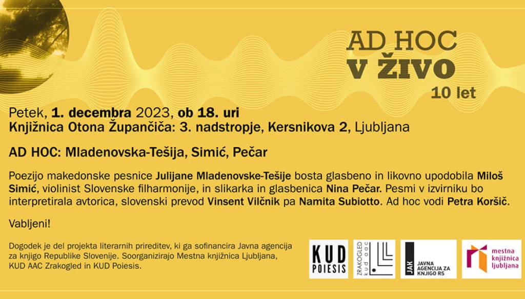 Poezijo makedonske pesnice Julijane Mladenovske-Tešije bosta glasbeno in likovno upodobila Miloš Simić, violinist Slovenske filharmonije, in slikarka in glasbenica Nina Pečar. Pesmi v izvirniku bo interpretirala avtorica, slovenski prevod Vinsent Vilčnik pa Namita Subiotto. Ad hoc vodi Petra Koršič.