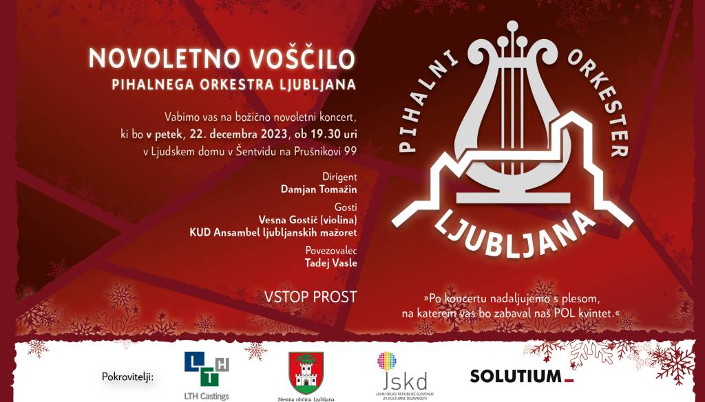 Ljudski dom Šentvid, Prušnikova ulica 99, LjubljanaVljudno vabljeni na božično novoletni koncert Pihalnega orkestra Ljubljana.