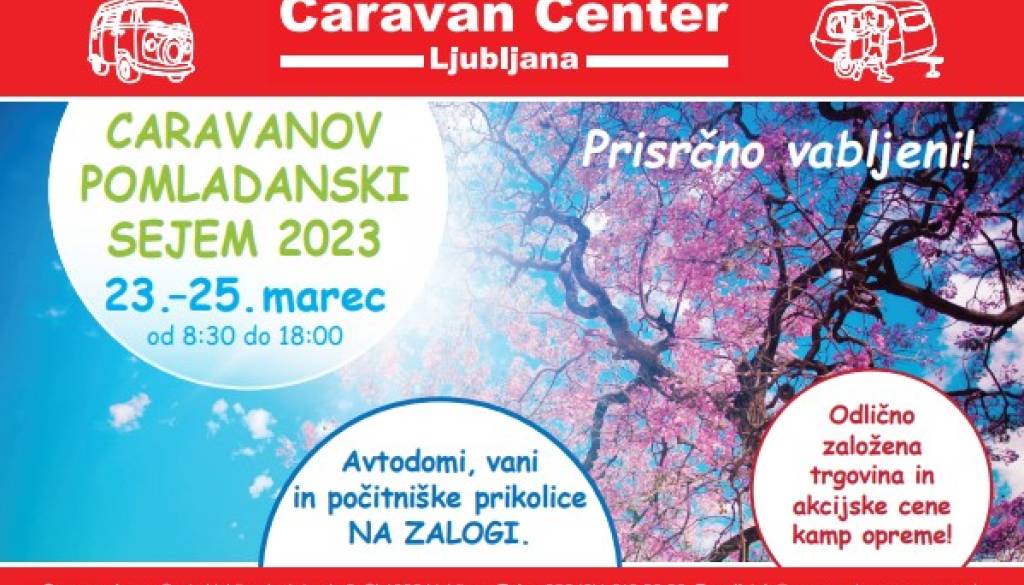 Caravan Center, Cesta ljubljanske brigade 9Vabimo vas da sezono kampiranja začnete z obiskom našega tradicionalnega CARAVANOVEGA POMLADANSKEGA SEJMA, ki bo potekal od četrtka, 23.3., do sobote, 25.3. Na ogled bodo novi in rabljeni avtodomi in počitniške prikolice, pripravil smo tudi akcijske ponudbe nakupa dodatne kamping opreme. Predstavili se bodo tudi naši dobavitelji.
