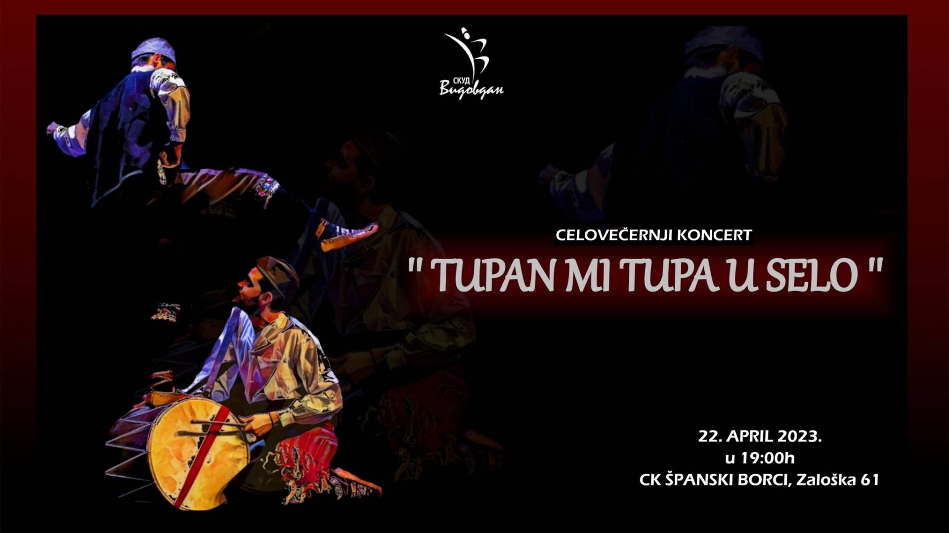 Španski borci - Center kulture v MostahČlani SKUD Vidovdan z gosti bodo v soboto, 22. aprila, v Kulturnem centru Španski borci s pričetkom ob 19. uri priredili svoj celovečerni koncert z naslovom »TUPAN MI TUPA U SELO«. Dvorana se odpira ob 18.30.
