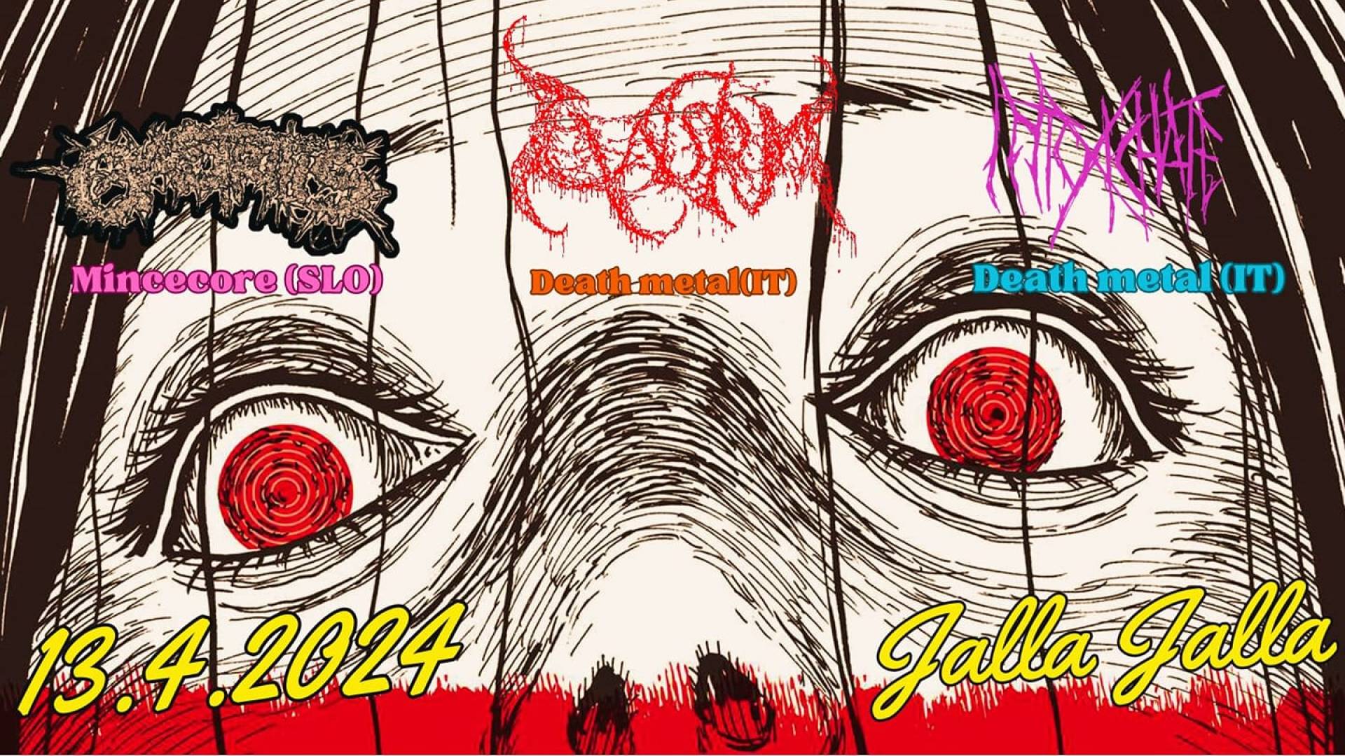 Jalla Jalla Akc MetelkovaPripravite se na nočno pustolovščino s tremi brutalnimi skupinami, Claustrum, Intoxicate in Gastritis! Ta neustrašni trio bo zavzel "oder" v bajti Jalle Jalle v Ljubljani naslednji petek, 13. aprila in vam ponudil eksperimentalno mešanico stare šole death metala.