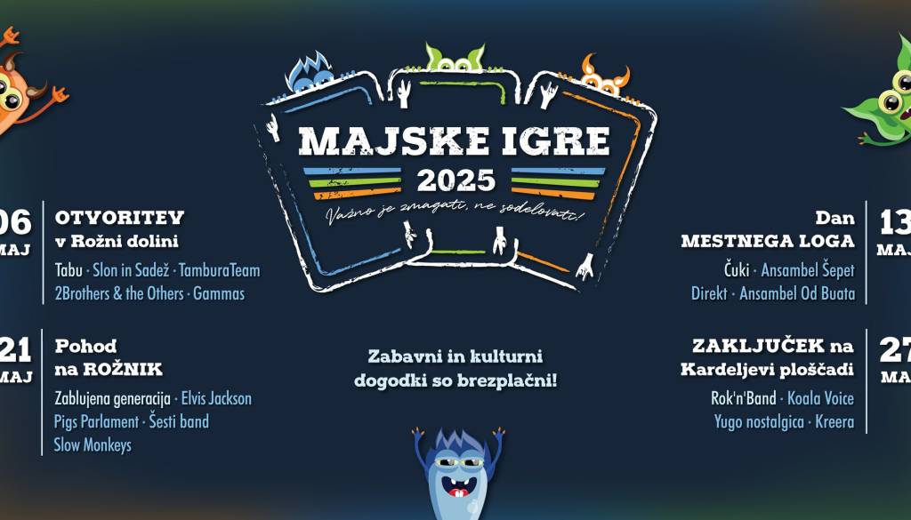 Dogajanje se bo začelo v študentskem naselju v Rožni dolini, 6. maja, nato pa se bomo zabavali še v Mestnem logu, 13. maja. Nadaljevali bomo 21. maja s pohodom na en in edini Rožnik. Pot je sicer dolga, ampak vsekakor se splača! Na jasi na Rožniku nas namreč vedno pričaka odlična rock glasba. Majske igre bomo zaključili 27. maja na Zaključku Majskih iger 2025, ki bo, kot vedno, potekal med študentskimi domovi na Kardeljevi ploščadi. Ne pozabite se udeležiti tudi športnih in kulturnih dogodkov, ki bodo potekali v okolici študentskih naselij.