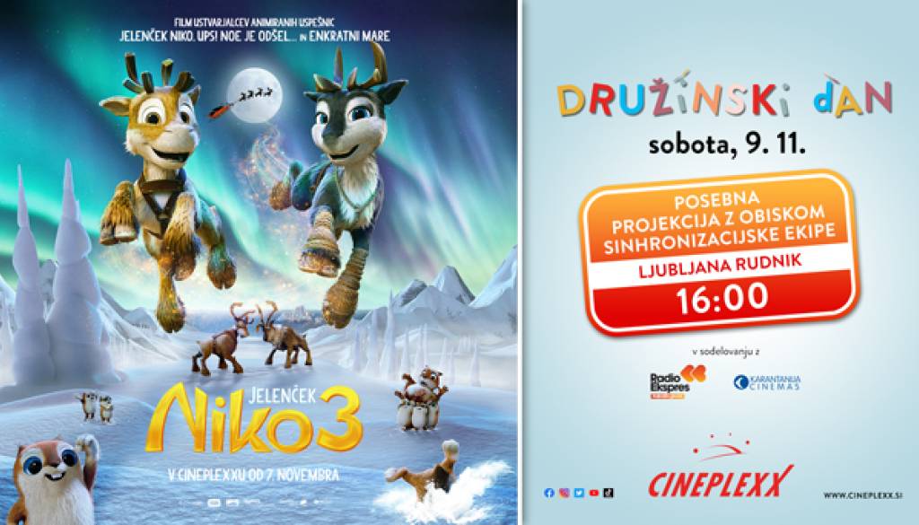 Cineplexx Ljubljana RudnikPridružite se nam na DRUŽINSKEM DNEVU s filmom JELENČEK NIKO 3, v soboto, 9. novembra 2024 v Cineplexxu Ljubljana Rudnik!