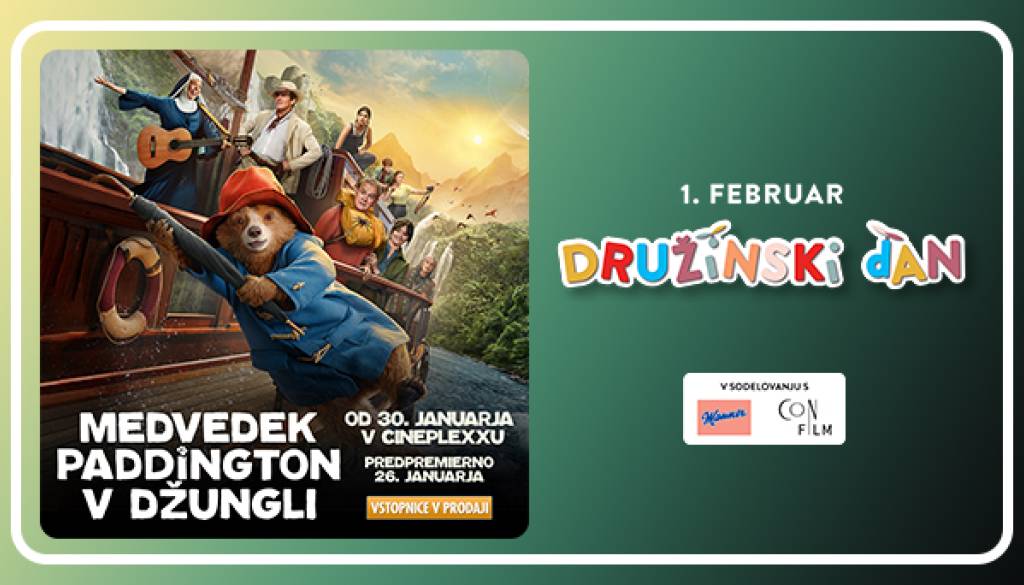 Cineplexx Ljubljana RudnikPridružite se nam na DRUŽINSKEM DNEVU s filmom MEDVEDEK PADDINGTON V DŽUNGLI v soboto, 1. februarja 2025 v Cineplexxu Ljubljana Rudnik!