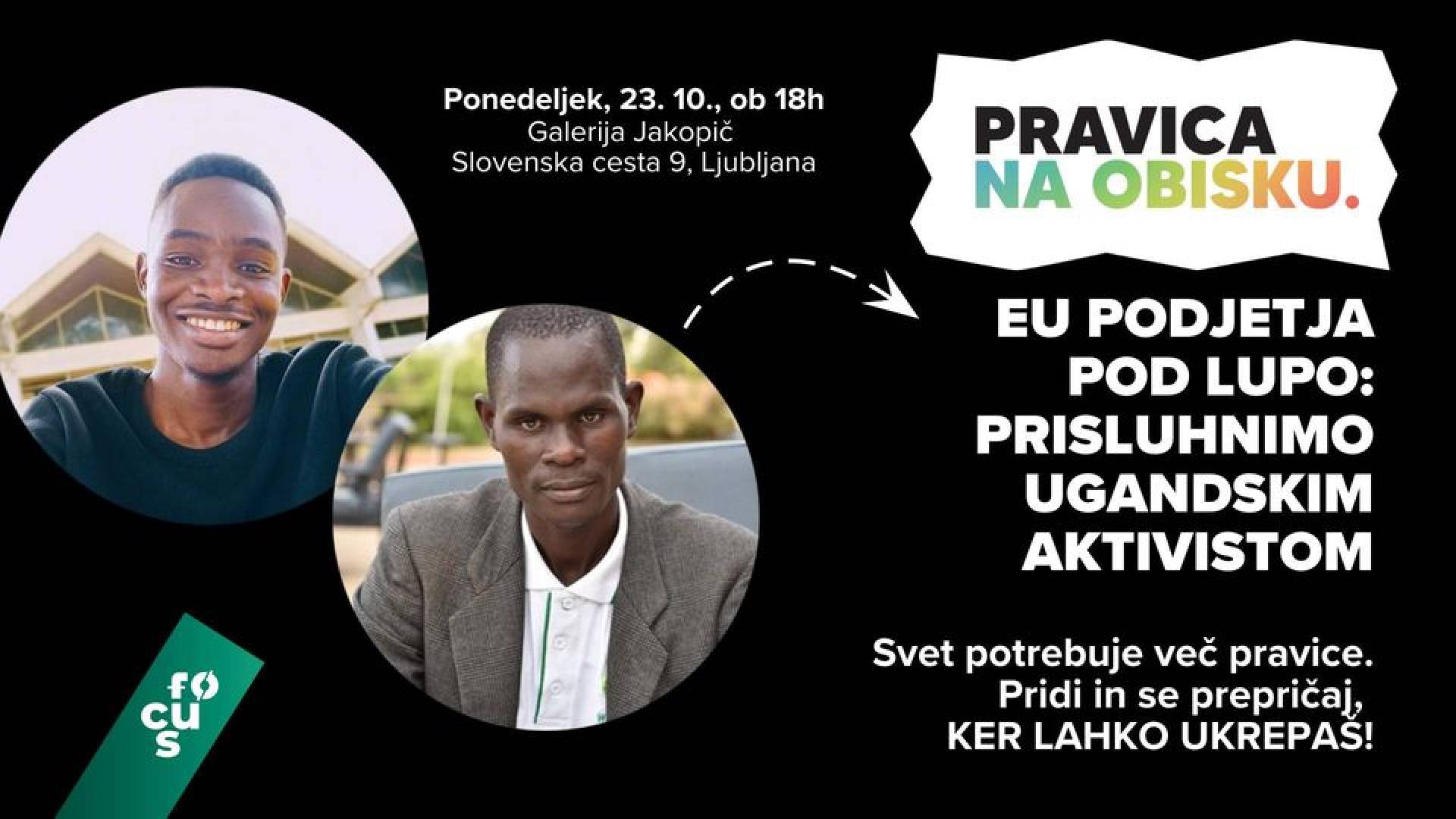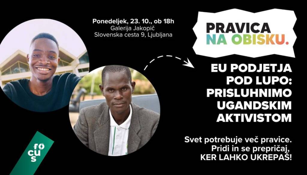 Galerija Jakopič, Slovenska c. 9V ponedeljek, 23. oktobra 2023 ob 18.00 v Galeriji Jakopič gostimo dogodek v organizaciji društva za sonaraven razvoj Focus. Aktivista iz Ugande Maxwell Atuhura in Nicholas Omonuk Okoit bosta v pogovoru, ki ga bo moderirala predsednica društva Živa Kavka Gobbo, iz prve roke spregovorila o izkušnjah v boju proti uničujočim dejavnostim mednarodnih korporacij v svojih skupnostih.