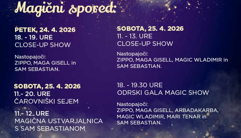 Na čarovniškem odru se bodo predstavili vrhunski domači in mednarodni umetniki, med njimi Maga Gisell, Zippo Guo, Arbadakarba, Magic Wladimir, Sam Sebastian ter Mari Tenar. Vsak izmed njih prinaša edinstven slog, ki združuje elemente magije, gledališča, plesa, cirkusa in vizualne umetnosti.