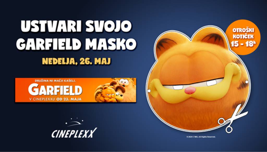 Cineplexx Ljubljana RudnikPridruži se nam v nedeljo, 26. maja 2024, v Cineplexxu Ljubljana Rudnik, med 15:00 in 18:00 uro v otroškem kotičku in si ustvari svojo Garfield masko!