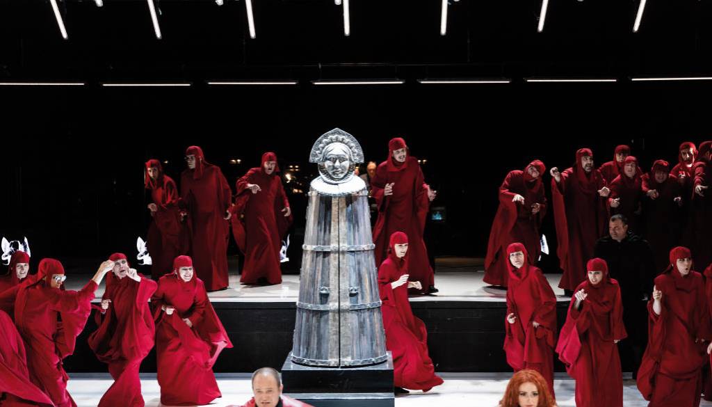 Fotografija: Pavel Šivic, Samorog, SNG Opera in balet Ljubljana, premiera 3. junija 2021; Matej Vovk, Urška Arlič Gololičič, v ozadju zbor. Foto: Darja Štravs Tisu; Arhiv SNG Opera in balet Ljubljana.