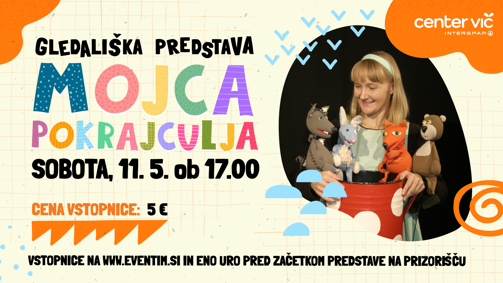 Ljubitelji pravljičnega sveta vabljeni v soboto, 11. maja ob 17. uri, v nov prireditveni prostor Centra Vič, kjer bo na odru zaživela zgodba Mojca Pokrajculja. Le kdo ne pozna priljubljene ljudske koroške pravljice o deklici Mojci, ki se nenadoma znajde obkrožena z novimi prijatelji? Lisica, volk, medved in zajec ji v znak zahvale vsak s svojimi spretnostmi priskočijo na pomoč pri delu in skupnih nalogah. A kot v vsaki pravljici, se zgodi nekaj nepričakovanega. Ponoči se pojavi neznani obiskovalec, ki poje med, ki so ga pridno nabrali. Kdo je ta skrivni gost in kakšne so posledice njegovega obiska? Pridite in odkrijte zaključek te čarobne pravljice, ki nas uči o prijateljstvu in solidarnosti. Vstopnice za otroke in odrasle spremljevalce so na voljo po enotni ceni 5 € in jih lahko enostavno kupite preko spletne strani www.eventim.si, ali pa si jih zagotovite eno uro pred začetkom predstave kar na prizorišču.