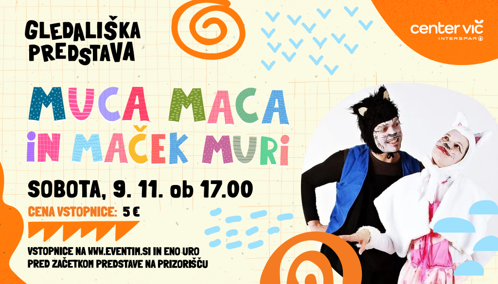 Vabimo vas, da se v soboto, 9. novembra, ob 17. uri pridružite v prireditvenem prostoru Centra Vič na zabavni predstavi Muca Maca in maček Muri. Pridružite se muci Maci, ki se po čarobnem potepu po Parizu vrne v mačje mesto in odpre svojo edinstveno klobučarno. Nekega jutra šokirano odkrije, da so njeni klobuki skrivnostno izginili. Na pomoč ji priskočita mačja policija in njen zvesti prijatelj, maček Muri. Skupaj se podajo na napeto in razburljivo iskanje tatu, ki je ukradel klobuke. Jim bo uspelo najti storilca in razrešiti skrivnost? Pridružite se nam na tej vznemirljivi dogodivščini in odkrijte, kako se bo mačja zgodba razpletla! Vstopnice za otroke in odrasle spremljevalce so na voljo po enotni ceni 5 €, kupite pa jih lahko preko spletne strani www.eventim.si ali si jih zagotovite eno uro pred začetkom predstave na prizorišču.