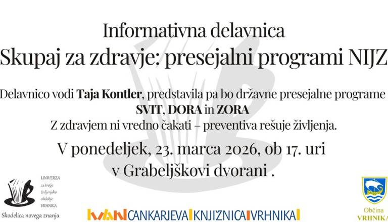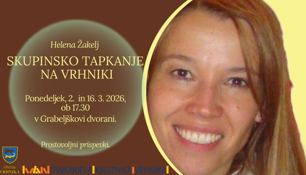 Cankarjeva knjižnica VrhnikaLepo vabljeni na enourno skupinsko tapkanje na Vrhniki. Tapkanje/EFT je tehnika čustvene svobode, orodje za sproščanje čustvenih napetosti. S prsti tapkamo po končnih točkah meridianov. Skupinsko tapkanje je odlična priložnost za ohranjanje stika s tehniko, za motivacijo za nadaljnje samostojno tapkanje in za spodbude pri vsakodnevnih premikih, ki so včasih videti majhni, a imajo lahko velik pomen. Tapkamo skupaj, čeprav ima vsak svojo specifično težavo/izziv v danem trenutku. Pri tem lahko začutimo podporo in moč skupine. Predznanje ni potrebno - le naša volja in odprtost. Srečanje bo vodila Helena Žakelj - navdušena tapkalka in EFT izvajalka 3. stopnje. Prostovoljni prispevki. Toplo vabljeni v ponedeljek, 2. in 16. 3. 2026, ob 17.30 v Grabeljškovo dvorano Cankarjeve knjižnice Vrhnika. Se vidimo.