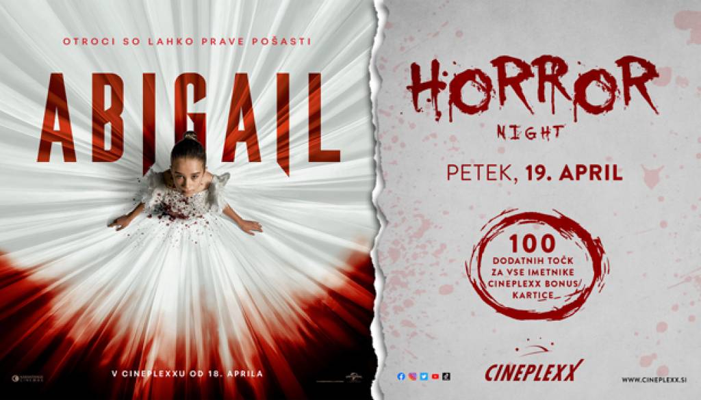 Cineplexx Ljubljana RudnikPridruži se nam na Horror nightu s filmom ABIGAIL, ki bo v petek, 19. aprila 2024! Imetnike naše CBC kartice bomo nagradili s 100 dodatnimi točkami!