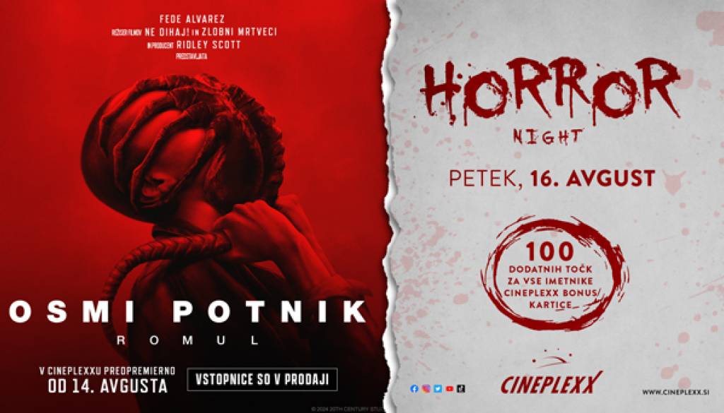 Cineplexx Ljubljana RudnikPridruži se nam na Horror nightu s filmom OSMI POTNIK: ROMUL, ki bo v petek, 16. avgusta 2024! Imetnike naše CBC kartice bomo nagradili s 100 dodatnimi točkami!