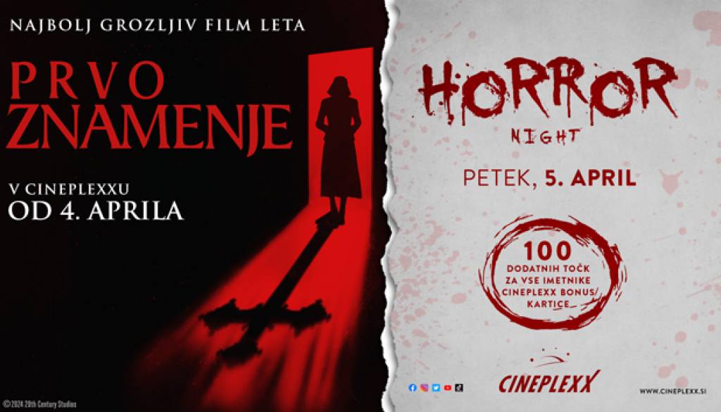 Cineplexx Ljubljana RudnikPridruži se nam na Horror nightu s filmom PRVO ZNAMENJE, ki bo v petek, 5. aprila 2024! Imetnike naše CBC kartice bomo nagradili s 100 dodatnimi točkami!
