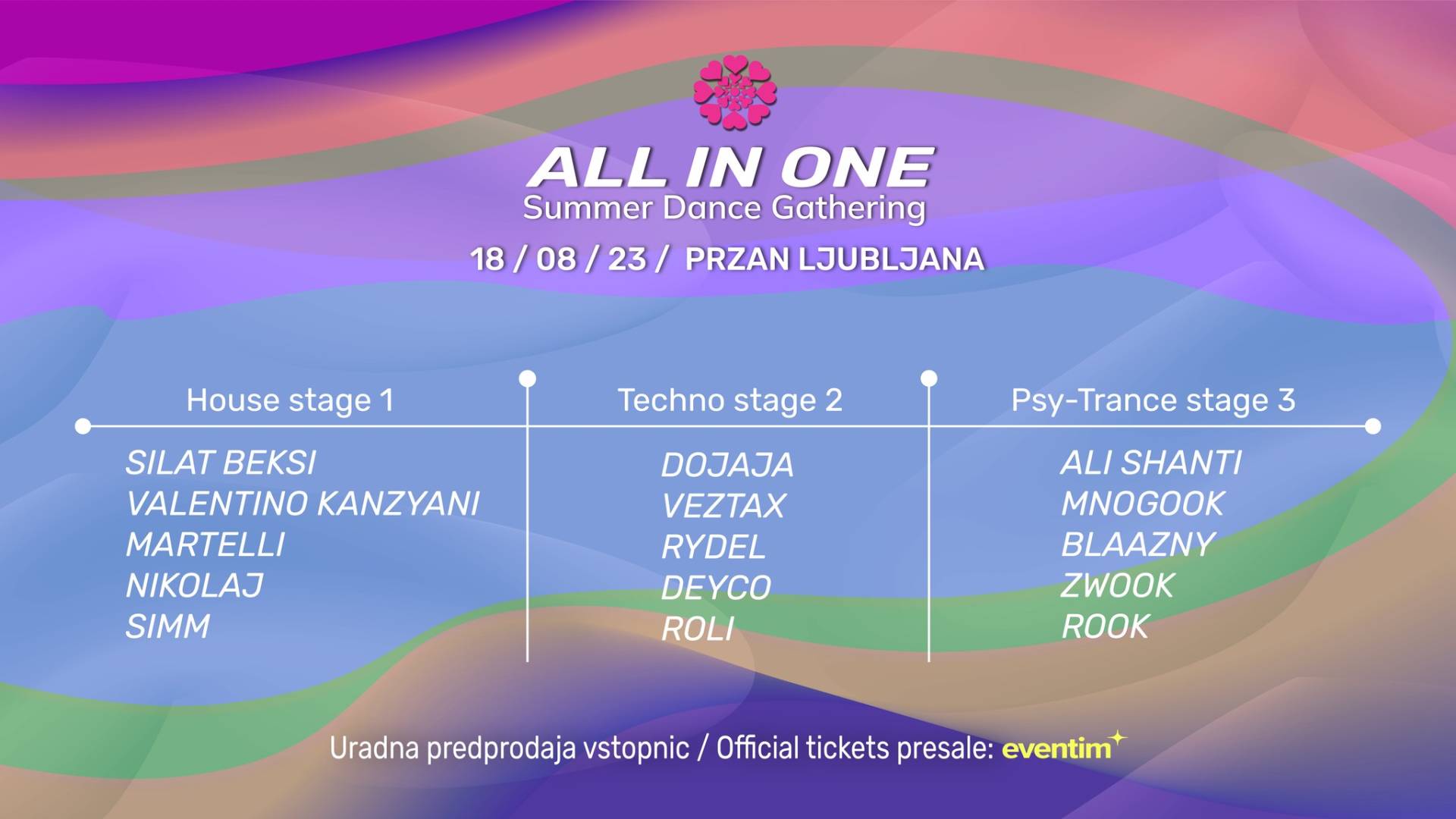 Z velikim zadovoljstvom vam predstavljamo našega ekskluzivnega gosta iz Ukrajine 𝙎𝙄𝙇𝘼𝙏 𝘽𝙀𝙆𝙎𝙄, glasbenega virtuoza, ki je s svojim trdim delom, unikatnim zvokom in ogromno izdaj uspel impresionirati ljubitelje glasbe po celem svetu. Je lastnik vinyl založbe MODEIGHT in varovanec booking agencije ORIGO, ki mu obeta svetovno turnejo in med drugim tudi prvi nastop v naši deželi. Našega drugega gosta in prijatelja ni potrebno posebej predstavljati, korenina in temelj slovenske scene 𝙑𝘼𝙇𝙀𝙉𝙏𝙄𝙉𝙊 𝙆𝘼𝙉𝙕𝙔𝘼𝙉𝙄, nekdanji rezident Ambasade Gavioli, predstavnik etiket kot so JESUS LOVED YOU, LUCKISON in švicarske booking agencije KEEP IT GOING. Njegova produkcijska dela pa so se znašla tudi na zelo uspešnih zalozbah kot so ( Intec, Yoshitoshi, Cadenza, Consumer Recreation.. ). Je veliki ljubitelj in kolektor vinil plošč, ki obsega širok spekter glasbe, tako da se pripravite na ekscelentno glasbeno fuzijo. Z velikim veseljem pa izrekamo dobrodošlico prav tako veteranu glasbenega podzemlja 𝙈𝘼𝙍𝙏𝙀𝙇𝙇𝙄-ju živečemu v Berlinski metropoli, ki se letos po nekaj letih ponovno vrača na slovenski oder in je tudi med mnogimi projekti idejni vodja ALL IN ONE projekta. Seveda pa ne smemo pozabiti omeniti naših dragih domačih gostov 𝙑𝙀𝙕𝙏𝘼𝙓, 𝘿𝙊𝙅𝘼𝙅𝘼, 𝙍𝙔𝘿𝙀𝙇, 𝙍𝙊𝙇𝙄, 𝙕𝙒𝙊𝙊𝙆, 𝙎𝙄𝙈𝙈, 𝘼𝙇𝙄 𝙎𝙃𝘼𝙉𝙏𝙄, 𝘿𝙀𝙔𝘾𝙊, 𝙉𝙄𝙆𝙊𝙇𝘼𝙅, 𝙈𝙉𝙊𝙂𝙊𝙊𝙆, 𝙍𝙊𝙊𝙆, 𝘽𝙇𝘼𝘼𝙕𝙉𝙔, ki so nekateri med njimi ze legende in redno aktivni ze vrsto let ter nekateri, ki so ravno v preboju svoje glasbeni poti. Mi ostajamo zvesti našemu motu 𝙇𝙀𝙎𝙎 𝙏𝘼𝙇𝙆, 𝙈𝙊𝙍𝙀 𝘿𝘼𝙉𝘾𝙀, tako da se vidimo 𝟭𝟴 𝘼𝙫𝙜𝙪𝙨𝙩𝙖 na plesišču pod zvezdami, kjer bomo skupaj pisali zgodovino.