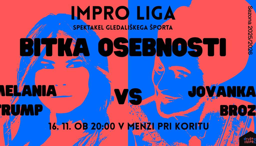 Predstavljamo vam BITKO OSEBNOSTI, kjer bomo vsako tekmo v fiktivni dvoboj prezence vrgli dve znani osebnosti. Vsako osebnost bo zastopala ena ekipa izkušenih improvizatorjev in improvizatork, ki se bodo pomerili v zabavnih odrskih izzivih, inspiriranih z vašimi predlogi. Zmagovalna ekipa bo tako sebe, kot svojo zastopano osebnost, pripeljala do slave.