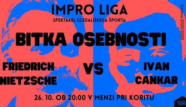 Menza pri Koritu, 1000 LjubljanaKer ima Impro liga odgovor na vse, smo se v tej sezoni z imenom 𝕂𝕒𝕛 𝕛𝕖 𝕓𝕠𝕝𝕤̌❔ odločili razrešiti velike polemike človeštva. NI ZA KEJ ČLOVEŠTVO.