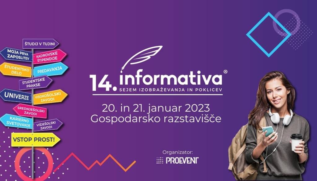 Na že 𝟭𝟰. 𝗜𝗻𝗳𝗼𝗿𝗺𝗮𝘁𝗶𝘃𝗶 𝘀𝗲 𝗯𝗼𝗱𝗼 𝟮𝟬. 𝗶𝗻 𝟮𝟭. 𝗷𝗮𝗻𝘂𝗮𝗿𝗷𝗮 𝟮𝟬𝟮𝟯 tik pred uradnimi informativnimi dnevi predstavile srednje šole, šolski centri, fakultete in univerze, višje strokovne šole, delodajalci, ponudniki obštudijskih dejavnosti in izobraževanj, dijaški in študentski domovi, možnosti študija in dela v tujini in še in še...