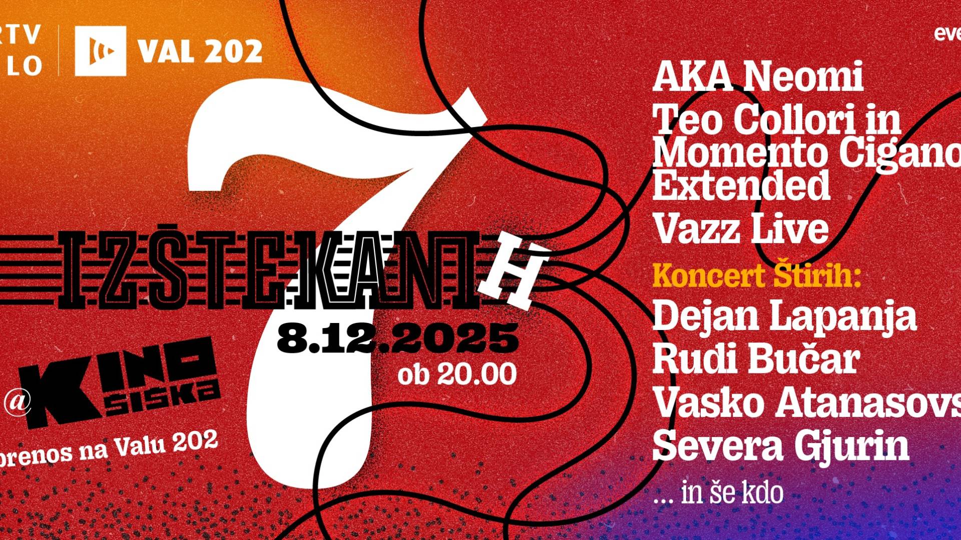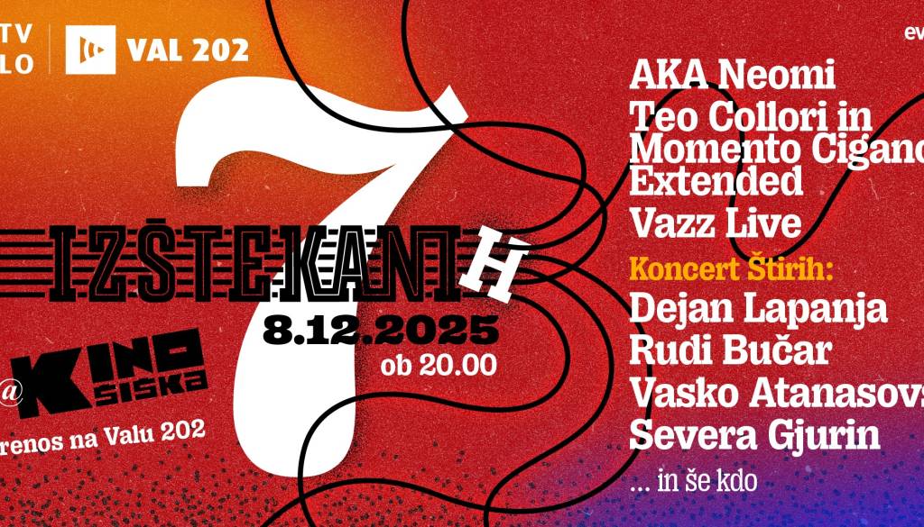 Kino ŠiškaTradicionalno decembrsko srečanje oddaje IZŠTEKANI z občinstvom v ljubljanskem Kinu Šiška tokrat nosi naslov IZŠTEKANIH 7. V duhu izštekane pravljice, ki se odvija vse od leta 1993, bo koncert zaznamovalo sedem imen: AKA NEOMI, TEO COLLORI in MOMENTO CIGANO EXTENDED, VAZZ LIVE ter KONCERT ŠTIRIH: Dejan Lapanja, Rudi Bučar, Vasko Atanasovski in Severa Gjurin. Kot običajno ga bo povezoval avtor in voditelj Jure Longyka. Spremljati ga bo moč v neposrednem prenosu na programu Vala 202 ali prek spleta v video obliki. V ponedeljek 8. decembra 2025 točno ob 20.00. In seveda Izštekani ne bi bili Izštekani, če ne bi v spored dodali še marsikaterega gosta presenečenja…