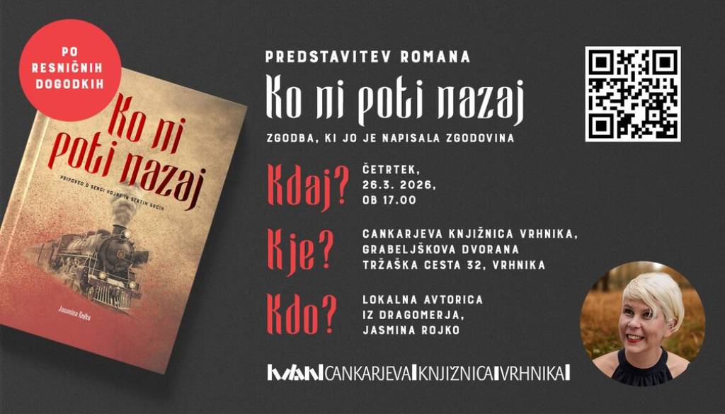 Cankarjeva knjižnica VrhnikaVabljeni na literarni večer z lokalno avtorico iz Dragomerja, Jasmino Rojko, ob predstavitvi knjige Ko ni poti nazaj. Opisuje pretresljivo zgodovinsko pripoved, ki se osredotoča na tragično usodo družine med drugo svetovno vojno in po njej. Zgodba se odvija skozi izkušnje Mirka Hajnžiča, njegove žene Zefike (Jožefe), njunih otrok in bližnjih sorodnikov ter razkriva uničujoče posledice vojne, okupacije in povojnih političnih pretresov na življenje preprostih ljudi. Roman ne išče krivcev z lahkoto in ne ponuja enostavnih odgovorov. Pripoveduje o vojni in tudi o tem, kar pride po njej – o tihem nasilju, o maščevanju, ki se imenuje pravica, in o življenjih, ki jih zgodovina povozi brez opravičila. A hkrati je to tudi zgodba o vztrajnosti, o starših, ki kljub vsemu držijo družino skupaj, o spominu, ki kljub bolečini ne ugasne, in o dostojanstvu, ki ga ni mogoče zapreti v taborišče. Ko ni poti nazaj ni le zgodba o eni družini, je zgodba o mnogih – in o času, ko je bilo preživetje največje dejanje poguma. Vabljeni na predstavitev knjige, ki bo v četrtek, 26. 3. 2026 ob 17.00, v Grabeljškovi dvorani.