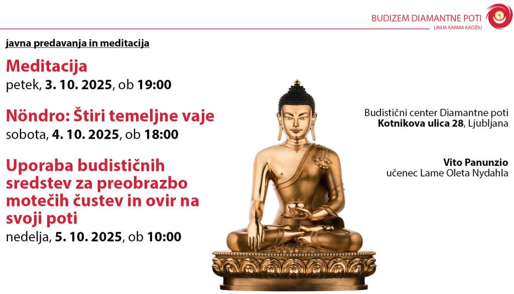 - nedelja, 5. 10. 2025, ob 10h: Uporaba budističnih sredstev za preobrazbo motečih čustev in ovir na svoji poti