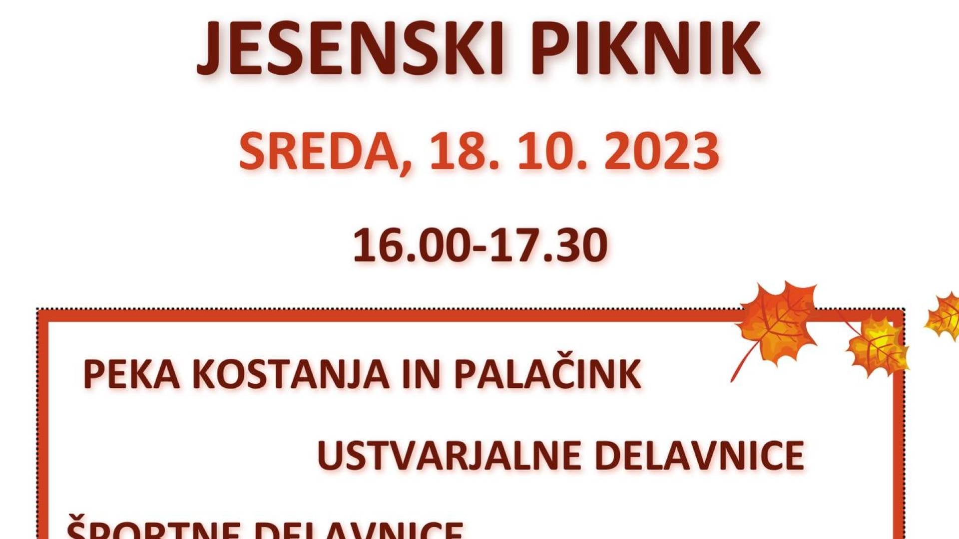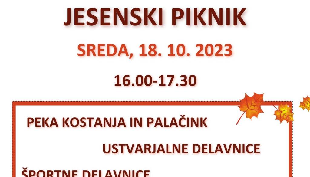 OŠ Vide PregarcVabljeni na jesenski piknik. Pekli bomo kostanj, ustvarjali, se igrali športne igre, peli in pogledali v nebo.