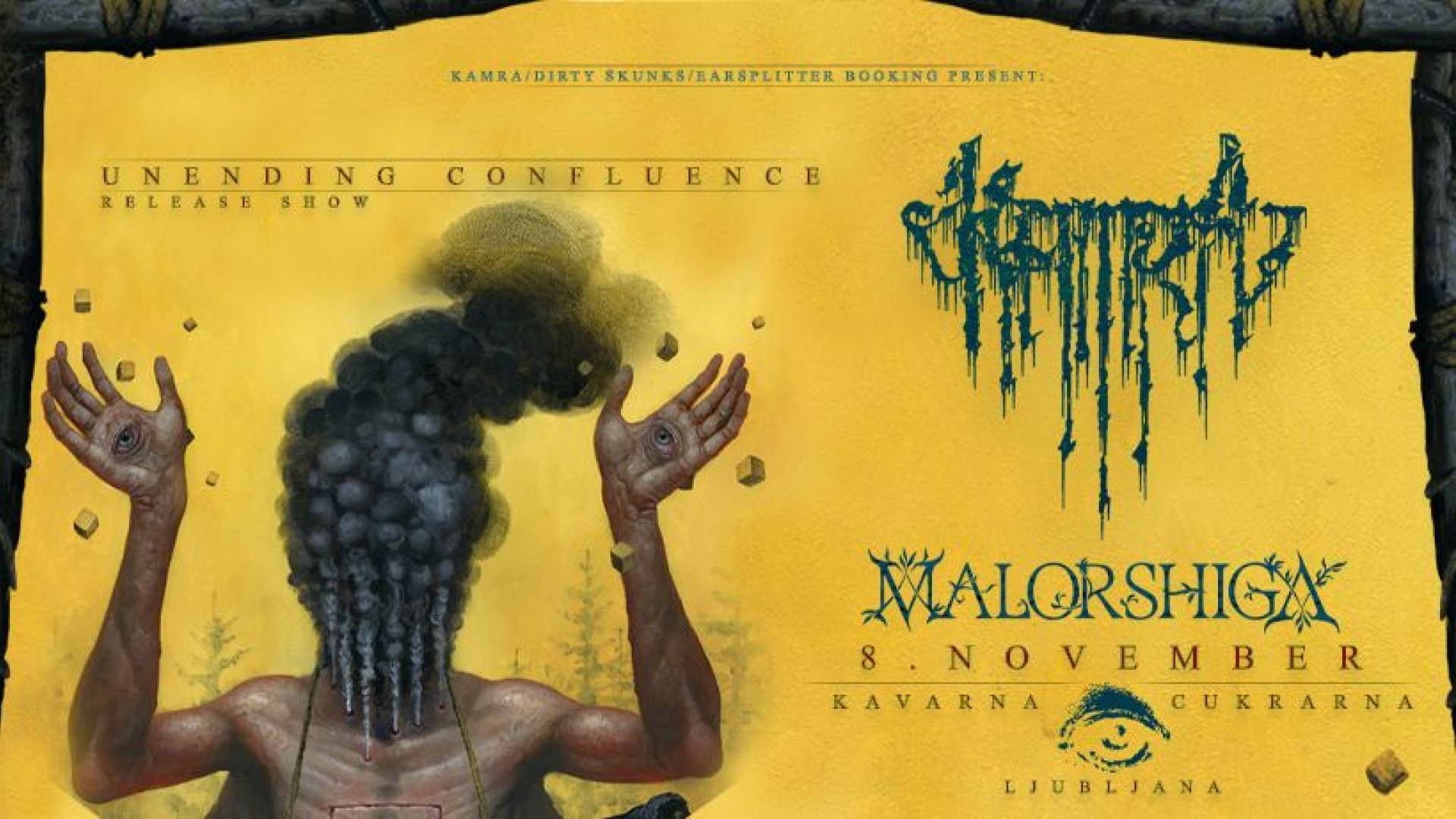 »𝕷𝖎𝖋𝖊 𝖇𝖚𝖗𝖓𝖘 𝖎𝖓 𝖙𝖍𝖊 𝖗𝖆𝖎𝖓 𝖔𝖋 𝖋𝖎𝖗𝖊 / 𝖆𝖓𝖉 𝖔𝖓𝖑𝖞 𝖙𝖍𝖊 𝖕𝖊𝖙𝖗𝖎𝖈𝖍𝖔𝖗 𝖗𝖊𝖒𝖆𝖎𝖓𝖘«Tako pojejo 𝔎𝔞𝔪𝔯𝔞 v skladbi Unlightment, in tako tudi začenja dihati njihov novi album 𝔘𝔫𝔢𝔫𝔡𝔦𝔫𝔤 ℭ𝔬𝔫𝔣𝔩𝔲𝔢𝔫𝔠𝔢. Ne le kot niz skladb, temveč kot prostor, kamor stopiš in se morda nikoli več ne vrneš.Tri leta po Cerebral Alchemy 𝔎𝔞𝔪𝔯𝔞 razprostira drugo kožo. 𝔘𝔫𝔢𝔫𝔡𝔦𝔫𝔤 ℭ𝔬𝔫𝔣𝔩𝔲𝔢𝔫𝔠𝔢, ki je 19. septembra izšel pri založbi Avantgarde Music je nekakšen čustven izbruh, ki vonj gnijočih trupel meša z opojnim vonjem jutranje kave in cigaret. Album je mentalno nestabilen, a natančno izbrušen. In ravno v tem je lepota, da ne veš, če stopaš v sanje, v nočno moro ali v oboje hkrati. Zasanjano natančno, duhovito zlomljeno. 𝔎𝔞𝔪𝔯𝔞 tudi tokrat ponuja temačno, vendar prefinjeno arhitekturo; kamro, ki namesto vrat ponuja portal v svet, iz katerega ni povratka.Black metal iz devetdesetih je bil tukaj zgolj seme … 𝔎𝔞𝔪𝔯𝔞 ga je raztrgala, gnila jedra prelila z esenco death metala in pustila, da vse skupaj cveti v blaznosti.In zdaj je vrata svoje kamre black metalu odprla 𝐂𝐮𝐤𝐫𝐚𝐫𝐧𝐚. Tista stavba, ki ji je Ivan Cankar pravil »veliko poslopje, črno in tiho, samotna velika hiša, mrtvašnica živih zavetišče umirajočih.«Nekoč je bila polna spolzkih stopnišč in temnih hodnikov. Zdaj sicer ni več taka, se bo pa svojih nekdanjih dni gotovo spomnila 𝟖. 𝐧𝐨𝐯𝐞𝐦𝐛𝐫𝐚, ko se bo na odru Kavarne 𝐂𝐮𝐤𝐫𝐚𝐫𝐧𝐚 obhajalo 𝔘𝔫𝔢𝔫𝔡𝔦𝔫𝔤 ℭ𝔬𝔫𝔣𝔩𝔲𝔢𝔫𝔠𝔢 in bo vonj po plesni spet prežel vsak kamen v tej sladki kamri.Prav na kamnu, istrskem kamnu, pa je zraslo še eno bitje. 𝔐𝔞𝔩𝔬𝔯𝔰𝔥𝔦𝔤𝔞, istrski ethno black metal kolektiv, v svoji glasbi tke olje in vino, morje in sol. Pripravljajo se na izdajo drugega albuma, naslovljenega 𝔙𝔢𝔫𝔱𝔬, ki ga bo ljubljanska publika prvič slišala prav v 𝐂𝐮𝐤𝐫𝐚𝐫𝐧𝐚. Nov material prinaša novo potenco: sodelovanje z mojstrom istrske ljudske glasbe Marinom Kranjcem in dalmatinsko klapo Semikanta.Tako boste 𝟖. 𝐧𝐨𝐯𝐞𝐦𝐛𝐫𝐚 priča dvojnemu obredu. 𝔎𝔞𝔪𝔯𝔞 se bo poklonila z 𝔘𝔫𝔢𝔫𝔡𝔦𝔫𝔤 ℭ𝔬𝔫𝔣𝔩𝔲𝔢𝔫𝔠𝔢, 𝔐𝔞𝔩𝔬𝔯𝔰𝔥𝔦𝔤𝔞 pa prvič prinaša dražilnik svojega drugega celovečerca. Dve sili, dva toka, dve roki, ki režeta iste rane.