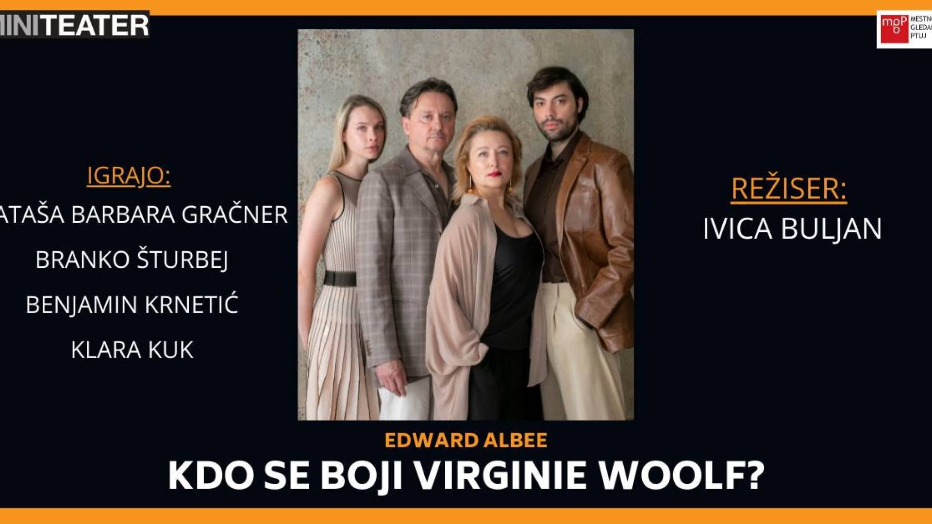 Albeejeva igra Kdo se boji Virginie Woolf je ob nastanku temeljno zaznamovala gledališče in film, pa tudi razumevanje sveta svojega časa. Vendar se z minevanjem časa ni postarala; s svojimi osrednjimi temami – zahtevo po uspehu, mitom o srečni družini z otroci, prepletom iluzije in resnice – je danes bolj živa kot kdajkoli. Poleg tega pa sijajno izpisana drama, v kateri se zgodba zakonskega razmerja prek velikih preobratov in razgaljenj odvija kot triler, ponuja možnost silovitih igralskih kreacij. Pod režijskim vodstvom Ivice Buljana se bodo v koprodukciji Mini teatra in MG Ptuj z njo spopadli štirje vrhunski umetniki iz srednje in najmlajše generacije slovenskih igralcev: Nataša Barbara Gračner, Branko Šturbej, Klara Kuk in Benjamin Krnetić.