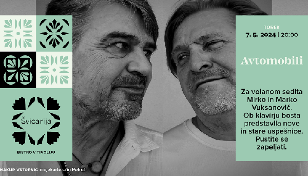 Tokrat bosta za volanom sedela Mirko in Marko Vuksanović, ustanovitelja skupine Avtomobili, ki pušča veliko sled na slovenski glasbeni sceni že več kot 40 let. Na koncertu bosta s klavirjem in vokalom predstavila nekaj njihovih najbolj legendarnih skladb, nekaj bo takih, ki jih kot skupina ne izvajajo, nekaj pa tudi novih, z aktualnega albuma »Sijaj«. Vsekakor bo to večer čarobne glasbe in prelepih besedil! Toplo vabljeni!