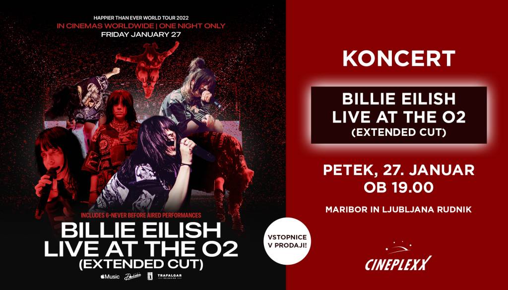 Cineplexx Ljubljana RudnikBILLIE EILISH prihaja na velika platna Cineplexxa Ljubljana Rudnik, v petek 27. januarja ob 19:00! V tehnologiji 4K in Dolby Atmos!