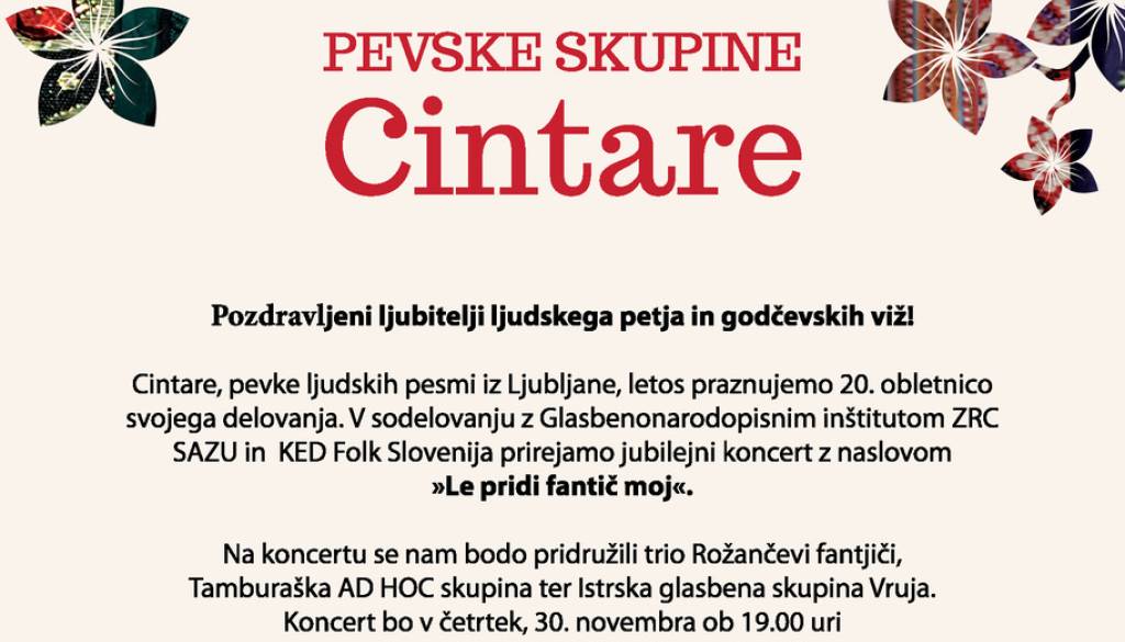 Atrij ZRCVabljeni na koncert pevske skupine Cintare, ki poustvarja slovenske ljudske pesmi. Na koncertu se bodo pevkam pridružil vidnejši poustvarjalci in poustvarjalke ljudske glasbe kot so trio Rožančevi fantjiči, Tamburaška AD HOC skupina ter Istrska glasbena skupina Vruja.