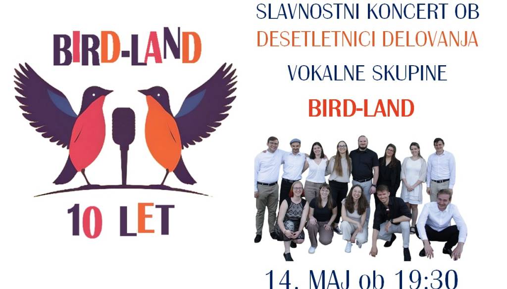 Dvorana Marjana Kozine, Slovenska filharmonijaVokalna skupina Bird-land bo ob svoji 10. obletnici delovanja izvedla slavnostni koncert v Slovenski filharmoniji. Slišali boste nekaj zelo znanih skladb, kot so Ain't no Sunshine, Take Five, Birdland, Living for the City, Cold Heart, Fallin'.... Info za vstopnice [email protected] ali GSM 041 650-510.