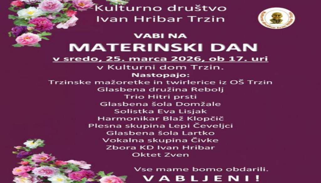 Kulturni dom TrzinKulturno društvo Ivan Hribar Trzin vabi na MATERINSKI DAN, ki bo v sredo, 25. marca 2026, ob 17. uri, v Kulturnem domu Trzin.
