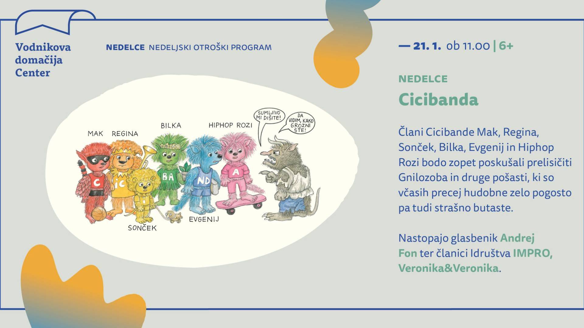 Cicibanda že leta navdušuje bralce Cicibana, tokrat pa bodo Mak, Regina, Sonček, Bilka, Evgenij in Hiphop Rozi nastopili tudi na Nedelcah. Seveda ne bodo manjkali niti Gnilozob in druge pošasti, ki so včasih precej hudobne zelo pogosto pa tudi strašno butaste! V svet Cicibande bode otroke popeljali glasbenik 𝗔𝗻𝗱𝗿𝗲𝗷 𝗙𝗼𝗻 ter članici društva IMPRO, 𝗩𝗲𝗿𝗼𝗻𝗶𝗸𝗮&𝗩𝗲𝗿𝗼𝗻𝗶𝗸𝗮.