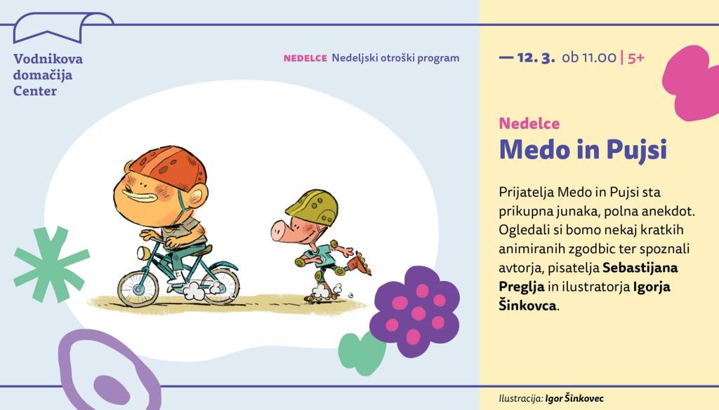 Prijatelja Medo in Pujsi sta prikupna junaka, ki s svojimi anekdotami vsak mesec v reviji Cicido razveseljujeta in zabavata otroke. Njune zgodbe so pravkar izšle tudi v slikanici. Ogledali si bomo nekaj kratkih animiranih zgodbic iz življenja Meda in Pujsija ter spoznali avtorja, ki sta si vse skupaj izmislila, pisatelja 𝗦𝗲𝗯𝗮𝘀𝘁𝗶𝗷𝗮𝗻𝗮 𝗣𝗿𝗲𝗴𝗹𝗷𝗮 in ilustratorja 𝗜𝗴𝗼𝗿𝗷𝗮 𝗦̌𝗶𝗻𝗸𝗼𝘃𝗰𝗮.