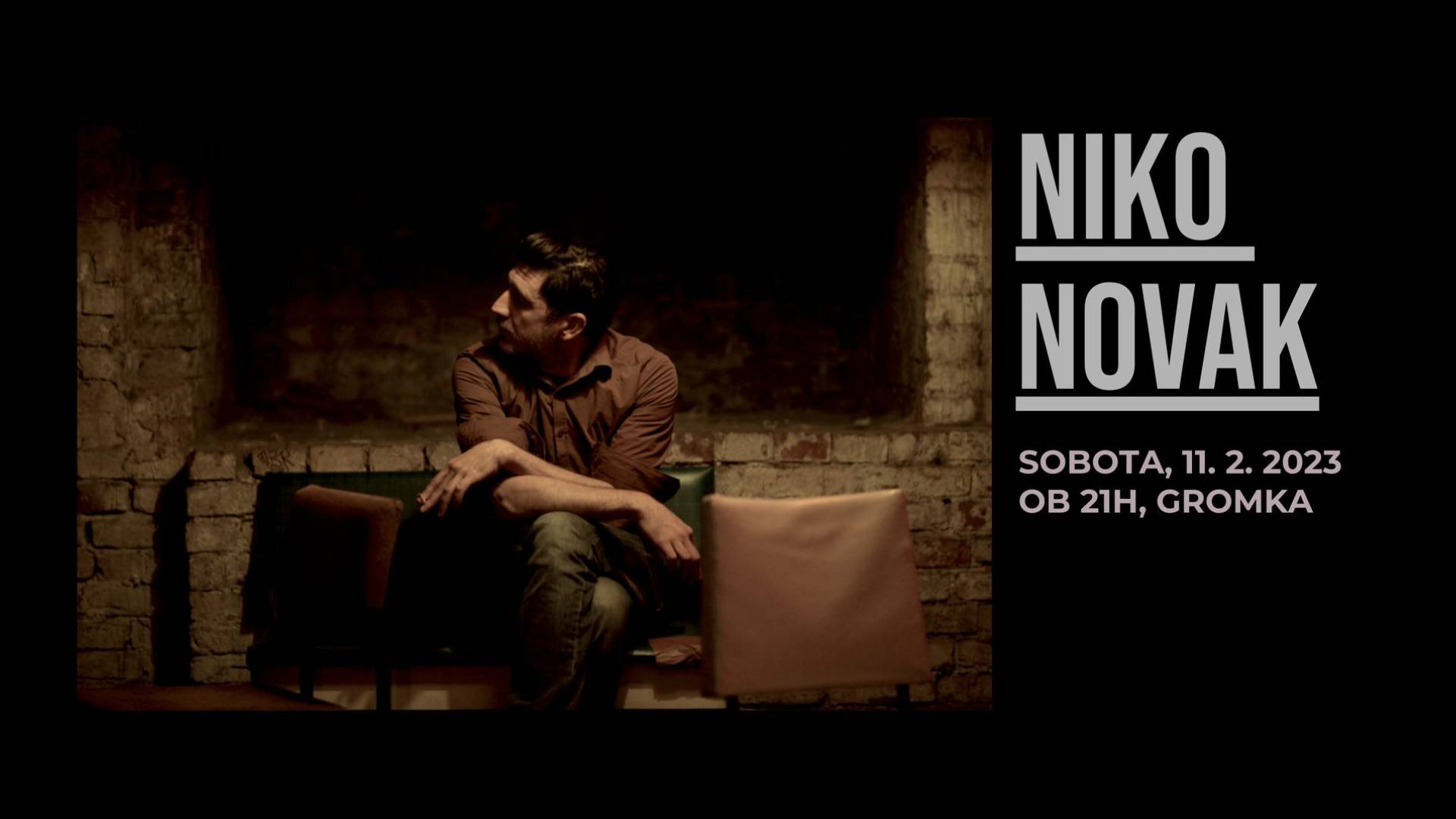 Klub Gromka, AKC MetelkovaSamotni potnik, podalpski bluesman, mrmrajoči kantavtor zrnatega glasu, ki je svojo pot začel kot frontman v divji rock'n'roll zasedbi Dicky B. Hardy, nadaljeval z blues duetom Incurabli, danes pa solo basist. Pripovedovalec pretkanih, umirjenih, ponočnjaških in zapeljivih zgodb Berlina in Ljubljane. »Poetika mestnega kavboja, znotraj katere se rad prepušča grehu in kazni ter prek katere se sporazumeva z demoni preteklosti. Niko Novak z življenjem hazardira z odprtimi kartami, a pri tem vseeno kakšno skrivnost obdrži izključno zase.« G. Bauman, Dnevnik