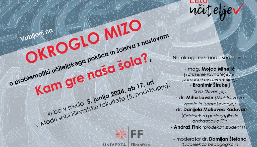 Filozofska fakulteta ULV sklopu prireditev ob Letu učiteljev vas vabimo na okroglo mizo o problematiki učiteljskega poklica in šolstva z naslovom Kam gre naša šola?, ki bo v sredo, 5. junija 2024, ob 17. uri v Modri sobi Filozofske fakultete (5. nadstropje).