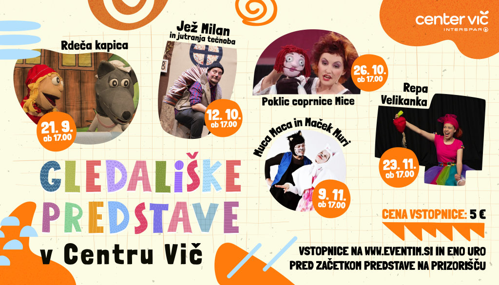 Center Vič odpira vrata nove gledališke sezone, ki bo polna čudovitih predstav za otroke in družine. V prihajajočih mesecih se bomo družili ob zgodbah, ki bodo zagotovo pričarale smeh in navdušenje med najmlajšimi. Naša prva predstava, ki bo obeležila začetek te sezone, je priljubljena zgodba Rdeča kapica. Pridružite se nam v soboto, 21. septembra ob 17.00, in se prepustite dogodivščinam pogumne deklice, ki bo skozi gozd srečala volka in mnoge druge zanimive like. Po Rdeči kapici bomo v Centru Vič gostili še štiri fantastične predstave: Jež Milan in jutranja tečnoba, Poklic coprnice Mice, Muca Maca in maček Muri ter Repa velikanka. Vsaka izmed teh zgodb nas bo popeljala v čaroben svet domišljije ter nas ob tem zagotovo naučila še kaj novega. Predstave bodo potekale ob izbranih sobotah v prireditvenem prostoru Centra Vič. Vstopnice po enotni ceni 5 € so že na voljo na spletni strani https://www.eventim.si/si/isci/?searchText=center+vi%C4%8D&lang=si ali eno uro pred predstavo na prizorišču. Zagotovite si svoje mesto in doživite čarobne jesenske popoldneve v prijetnem ambientu Centra Vič!
