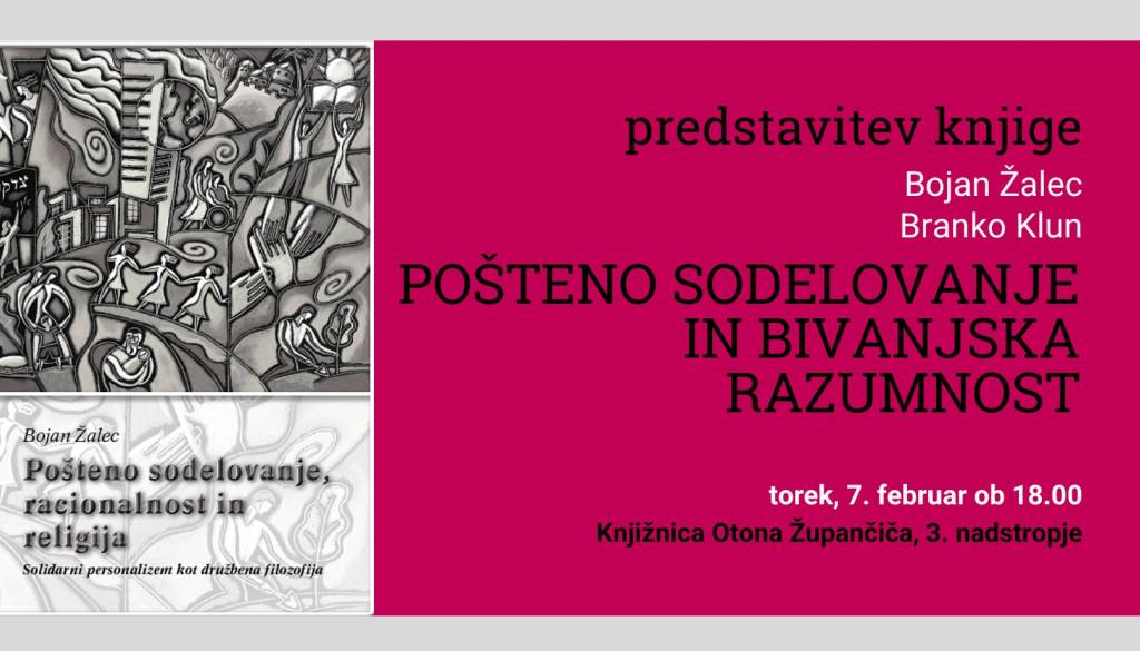 Naš tokratni gost, prof. dr. Bojan Žalec, je profesor na Teološki fakulteti Univerze v Ljubljani in redni član Evropske akademije znanosti in umetnosti, bo predstavil svojo najnovejšo knjigo dr. Žalca Pošteno sodelovanje, racionalnost in religija: solidarni personalizem kot družbena filozofija, Ljubljana: Družina 2022.