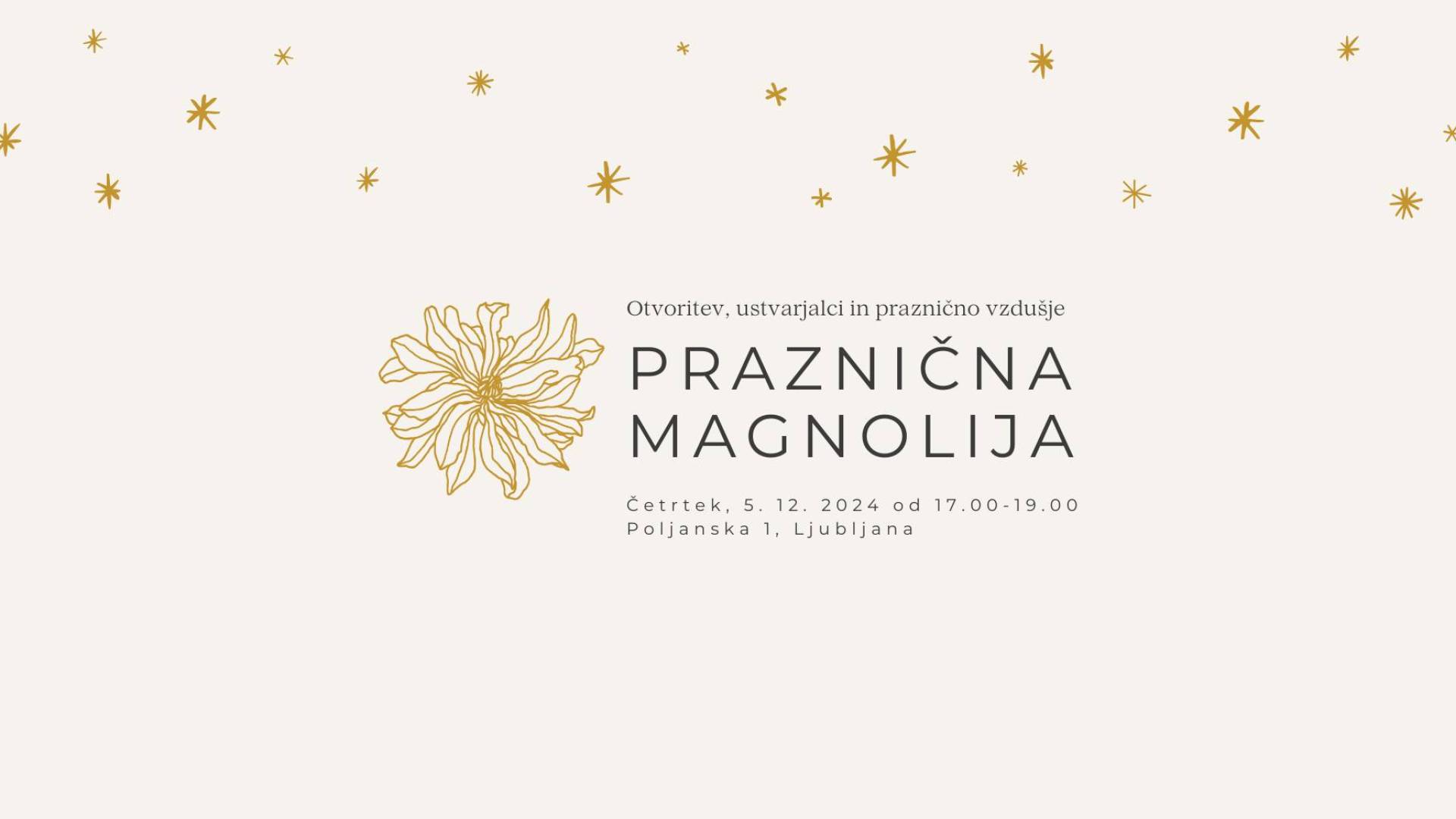 Poljanska 1, LjubljanaVabljeni na otvoritev nove Prodajne galerije Magnolija, ki bo potekala v četrtek, 5. decembra 2024, med 17. in 19. uro na Poljanski cesti 1 v Ljubljani. (stavba Peglezn) Galerija Magnolija je prostor, kjer se prepletajo umetnost, oblikovanje in unikatni ročno izdelani izdelki lokalnih ustvarjalcev.