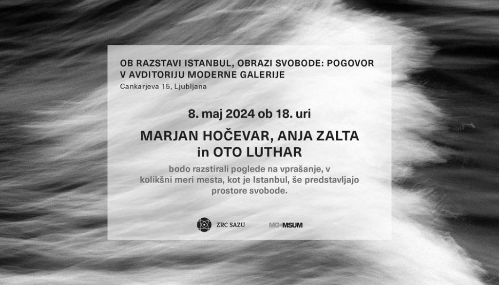 Ob razstavi Manca Juvan: Istanbul, Obrazi svobode vas vabimo na predstavitev knjige in pogovor z avtorji in drugimi strokovnjaki s področja v sredo, 8. maja 2024, ob 18. uri v avditoriju Moderne galerije. Marjan Hočevar, Anja Zalta in Oto Luthar bodo razstirali poglede na vprašanje, v kolikšni meri mesta, kot je Istanbul, še predstavljajo prostore svobode.