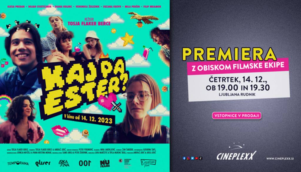 Cineplexx Ljubljana RudnikPridruži se nam na PREMIERI filma KAJ PA ESTER?, ki bo v Cineplexxu Ljubljana Rudnik, v četrtek, 14. decembra ob 19:00 in 19:30. Obiskala nas bo tudi filmska ekipa!
