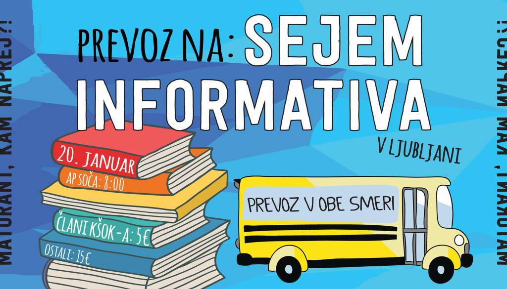 Informativa🌞🎒 Dijaki, dijakinje in vsi _ e, ki razmišljate o študiju, v sklopu projekta 𝐌𝐚𝐭𝐮𝐫𝐚𝐧𝐭, 𝐤𝐚𝐦 𝐧𝐚𝐩𝐫𝐞𝐣?! vam nudimo subvencioniran prevoz na sejem Informativa, v obe smeri.