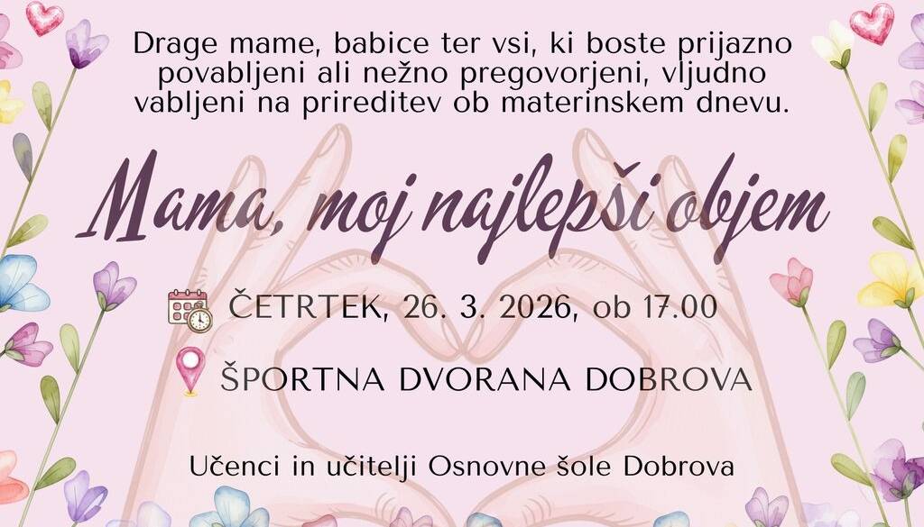 Športna dvorana Dobrova, Cesta 7. maja 20, 1356 DobrovaUčenci in učitelji OŠ Dobrova vabijo na prireditev MAMA, MOJ NAJLEPŠI OBJEM.