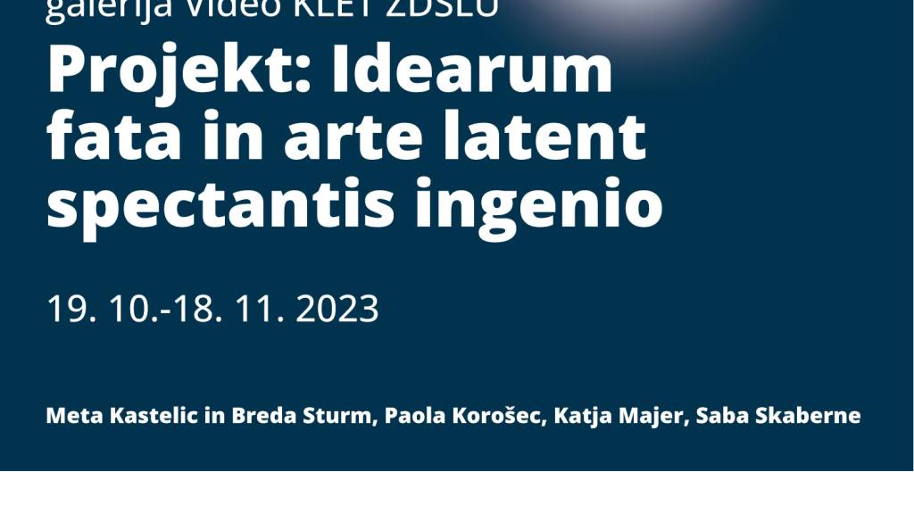 Galerija Video KLET ZDSLUSekcija kiparjev in umetnikov, ki delujejo v javnem prostoru Zveze društev slovenskih likovnih umetnikov vas vljudno vabi na odprtje skupinske razstave z naslovom "Idearum fata in arte latent spectantis ingenio", avtoric: Mete Kastelic in Brede Sturm, Paole Korošec, Katje Majer in Sabe Skaberne, v četrtek, 19. oktobra 2023 ob 18. uri v Galerijo Video KLET ZDSLU, Komenskega 8, Ljubljana.